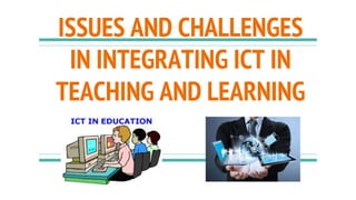 This document discusses issues and challenges with integrating information and communication technology (ICT) into teaching and learning in Malaysia. It outlines the Malaysian Smart School Project which aims to systematically reinvent teaching practices and school management to prepare students for the Information Age. The main goals of the project are to democratize education, produce critical thinkers, provide well-rounded student development, increase stakeholder participation, and cultivate lifelong learning based on ICT skills. The document also discusses advantages and disadvantages of using ICT tools for education, and strategies to address challenges like the need for infrastructure upgrades, teacher training, and technical support.