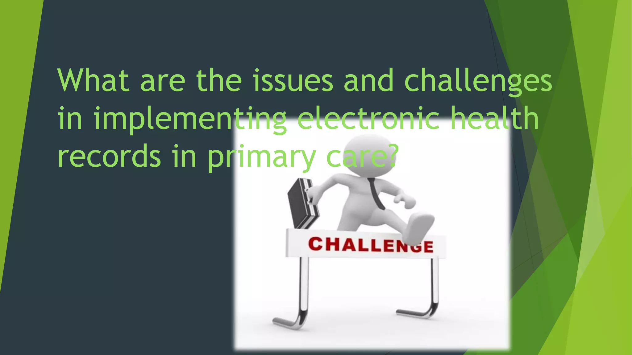 There are several key issues and challenges in implementing electronic health records in primary care according to the document. These include clinical data entry issues due to unreliable data sources and lack of standard terminology. There is also resistance to computer technology among some medical professionals who prefer paper records or find electronic systems difficult to use. Additionally, high costs of computer systems and lack of funding present obstacles. Privacy, security, and accuracy of patient information stored electronically are additional concerns that must be addressed. Personnel shortages with the necessary IT skills to utilize electronic systems effectively also pose a challenge.