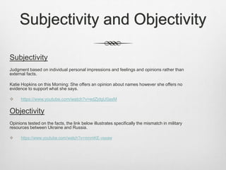 This document discusses various concepts relating to objectivity, subjectivity, impartiality in news reporting, and different types of documentary formats. It provides definitions and examples for key terms like subjectivity, objectivity, balance and impartiality in news reporting. Examples are given of different types of documentary formats such as expository, observational, dramatization, and narrativization. Videos are linked to illustrate concepts like news readers, field reporters, interviews, and actuality footage in news programming.