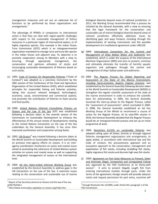 This document provides an overview of international commitments and progress on sustainable ocean management. It discusses the importance of oceans, including their role in supporting life, driving climate cycles, and providing food and resources that support hundreds of millions of livelihoods. While agreements like UNCLOS and the Johannesburg Plan of Implementation recognize oceans' importance, implementation of sustainable ocean policies has been slow. Existing initiatives and agreements have had limited effectiveness in addressing threats like overfishing, pollution, and loss of coastal and marine habitats. Continued international cooperation is needed to close remaining policy gaps and more fully achieve the goal of healthy, productive oceans.