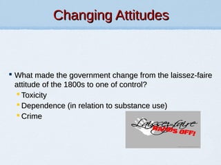 The document discusses changing attitudes towards substance use and regulation from the 1800s to present. It covers factors like toxicity, dependence, and crime that influenced more controlling policies. Toxicity can refer to both acute and chronic physiological and behavioral effects. Dependence involves tolerance, withdrawal, and psychological preoccupation. Data on drug-related emergency visits and deaths provides some information on dangers but does not capture relative risk or consider number of users. Laws aim to reduce costs to society from dangers of certain drug use, but not all policies have been rationally conceived or effective at achieving this.