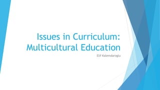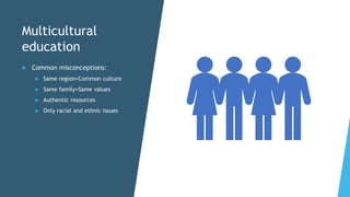 This document discusses issues related to multicultural education. It notes that the student population is becoming increasingly diverse while the teacher population remains mostly white. This can lead to biases and a lack of understanding between teachers and students from different cultures. The document advocates for multicultural education approaches that incorporate the contributions of all cultures, use cooperative learning, and address socioeconomic differences to create an equitable education for all students. It provides examples of cultural differences that should be considered and recommends teaching strategies like using multiple perspectives and community learning.