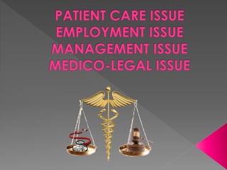 A 1991 study identified several major problems facing nursing in 119 countries including India. These included a lack of nurses prepared for administrative roles, acute staffing shortages, and poor relationships between nursing education and services. Additional issues included a lack of nursing authority, weak teamwork and collaboration, insufficient resources, and unsupportive administrative structures. The document further discusses various employment, ethical, legal, and practice issues impacting the nursing profession.