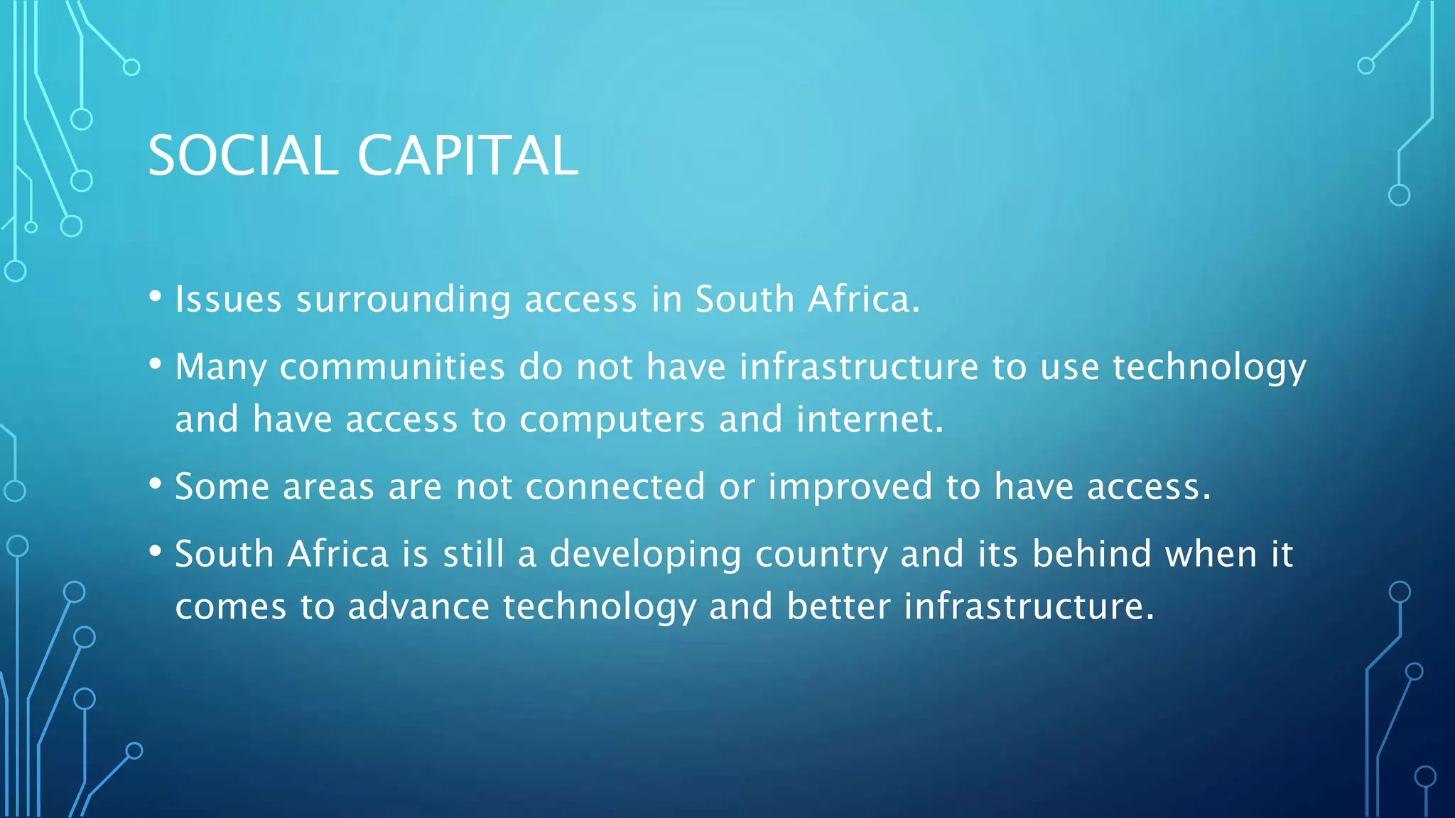 Many communities in South Africa do not have access to computers or the internet due to a lack of infrastructure. This digital divide is caused by poverty and a lack of education. People cannot effectively use or access technology because they lack knowledge about how it works and are unfamiliar with social media. While some areas have good infrastructure, others do not have access to internet networks due to the high costs of providing it, restricting human capital. The government needs to provide more access to technology and internet connections to help communities compete and encourage e-learning to develop digital skills.