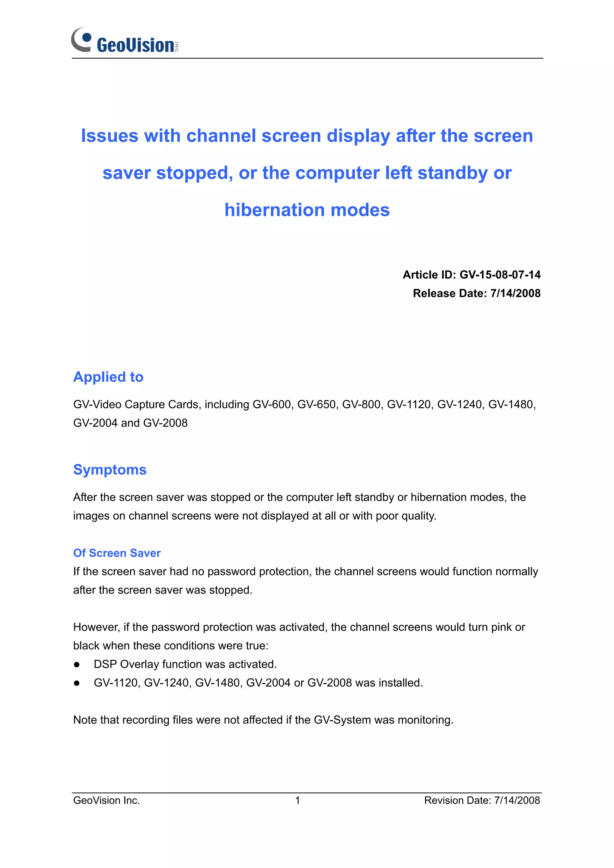 This document summarizes issues with the display of channel screens on GV-Video Capture Cards after the screen saver stops or the computer exits standby or hibernation mode. When the screen saver has password protection activated, channel screens turn pink or black on certain cards when the DSP Overlay function is enabled. Exiting standby or hibernation mode causes loss of video signals or mosaic images on some cards, and black screens on other cards. Restarting the computer or GV-System restores normal display, and disabling password protection or hibernation is recommended to prevent future issues.