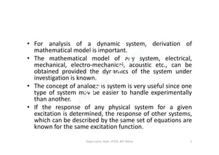 The document discusses analogous systems and provides examples of electrical-mechanical analogies. Analogous systems are physical systems that can be described by identical differential equations or transfer functions. An electrical system of resistors, capacitors and inductors may be analogous to a mechanical system of masses, dampers and springs. The equations for a translational mechanical system subjected to force are analogous to electrical circuit equations. Similarly, the equations for a rotational mechanical system subjected to torque are analogous to other electrical circuit equations. The document provides examples of modeling translational and rotational mechanical systems and their electrical analogies using either force-voltage or force-current analogies. Key components are mapped between the two domains.