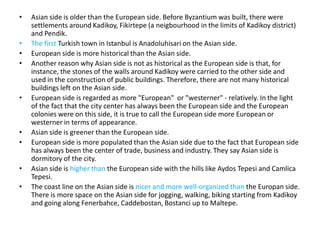 The document compares various characteristics of the Asian and European sides of Istanbul. It notes that the Asian side is generally older, greener, and less developed than the European side. Some key differences mentioned include: