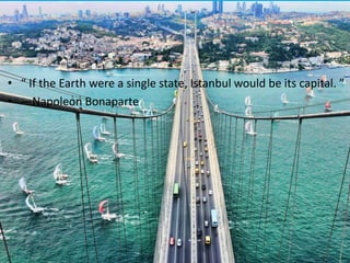 Istanbul is the largest city in Turkey, located on both the European and Asian continents. It has a long history serving as the capital of various empires. Some of Istanbul's most prominent landmarks include Hagia Sophia, the Blue Mosque, Topkapi Palace, and the Grand Bazaar. Istanbul offers a blend of both modern culture and a wealth of historic sites dating back to ancient Roman and Byzantine times.