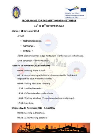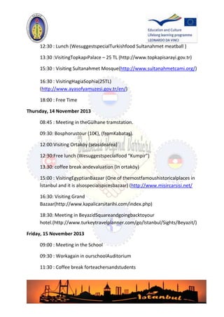 The document provides an itinerary for a teacher exchange program in Istanbul, Turkey from November 11-16, 2013. The schedule includes: