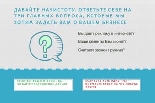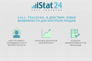 Документ описывает инструменты колл-трекинга, позволяющие анализировать эффективность рекламных кампаний через отслеживание звонков от клиентов. Он рассматривает два вида колл-трекинга: классический и динамический, каждый из которых имеет свои преимущества и недостатки. Основная цель использования колл-трекинга заключается в оптимизации маркетингового бюджета и повышении эффективности рекламных источников.