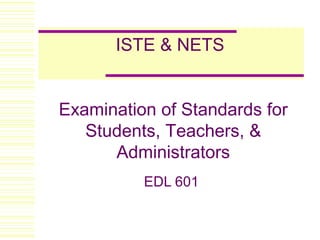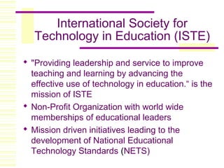 The document discusses the International Society for Technology in Education (ISTE) and their development of the National Educational Technology Standards (NETS) for students, teachers, and administrators to provide guidance on effective use of technology in education. It examines ISTE resources and reflects on how their mission aligns with one's school. Key standards are introduced for students, teachers and administrators regarding technology skills and integration.