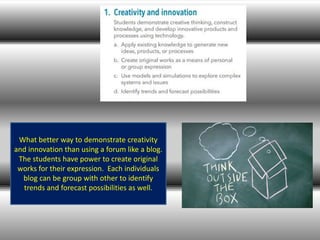 This document discusses how blogging can help students align with ISTE standards by allowing them to demonstrate creativity, communicate and collaborate digitally, and manage projects. Blogging is suggested as a forum for students to identify problems, plan activities, view classmates' progress, and collaborate on projects. Maintaining a blog also helps students learn how to navigate the internet, use technology effectively, and transfer their knowledge to new technologies.