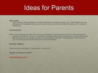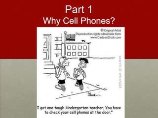 Liz Kolb discusses using student-owned cell phones in K-12 classrooms for learning activities like flashcard reviews, help lines, and local scavenger hunts. She argues that cell phones should be utilized because most students already own them, they support skills needed for 21st century jobs, and research shows positive impacts on learning. However, teachers may be reluctant due to a history of unsuccessful educational technology initiatives and concerns about cheating.