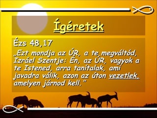 Ígéretek Ézs 48,17„ Ezt mondja az ÚR, a te megváltód, Izráel Szentje: Én, az ÚR, vagyok a te Istened, arra tanítalak, ami javadra válik, azon az úton vezetlek, amelyen járnod kell.”