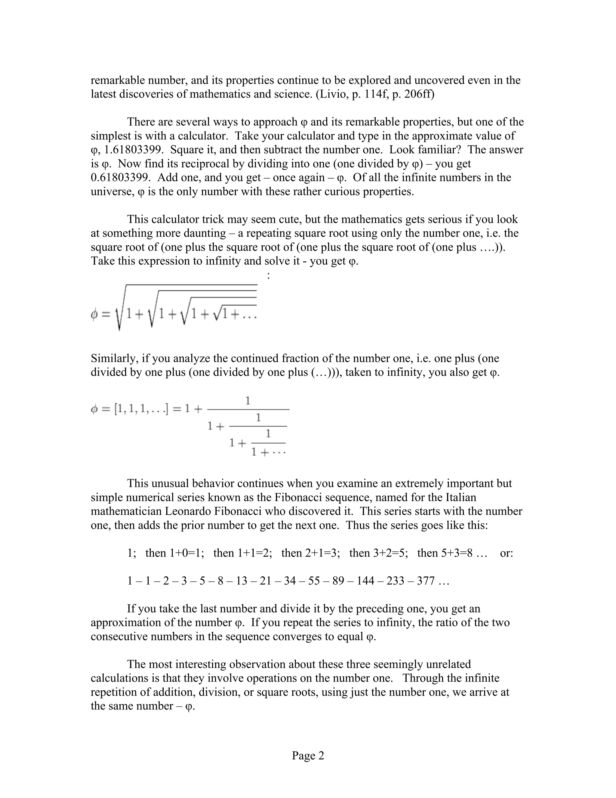 The document discusses the spiritual significance of the number phi (φ). Phi is known as the golden ratio and is ubiquitous in nature and art. Mathematically, phi can be derived through infinite operations on the number 1, such as repeated square roots or the Fibonacci sequence. The author argues that phi may correspond spiritually to God's infinite unfolding of creation from the infinite to the finite. Phi represents qualities of harmony and efficiency evident in creation. Its appearance in spirals is seen as symbolic of spiritual growth and regeneration towards conjunction with God. The analysis provides a new perspective on mathematical principles and their connection to spiritual truths.