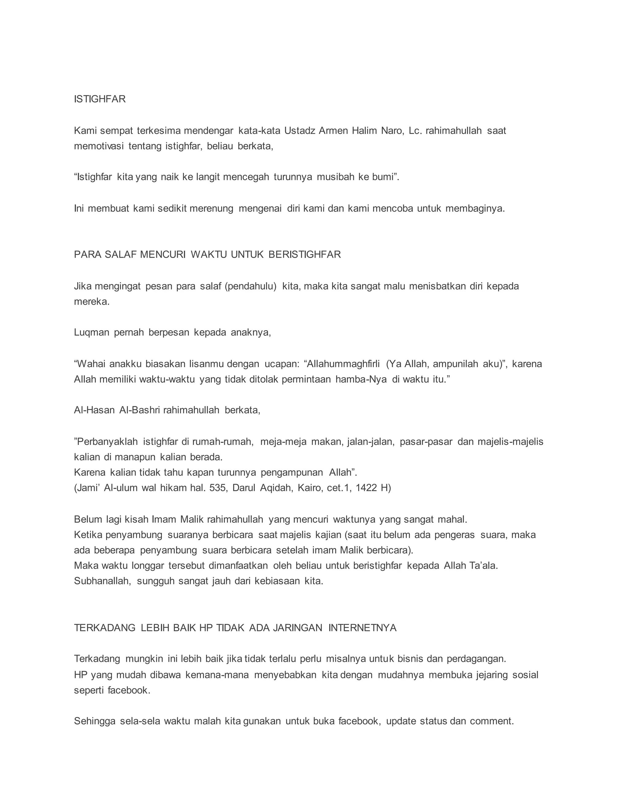 Teks tersebut memberikan penjelasan tentang pentingnya istighfar dan dzikir dalam kehidupan sehari-hari. Istighfar dapat menghapus dosa, mencegah musibah, dan mempermudah menghadapi kesulitan. Dzikir sederhana seperti "Subhanallah wa bihamdih" dapat menghapus dosa dan memberi kekuatan rohani. Teks ini menganjurkan agar memanfaatkan waktu untuk istighfar dan dzikir, bukan unt