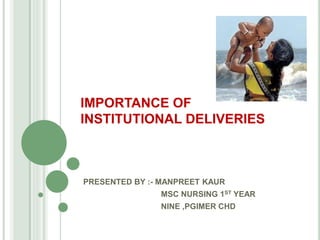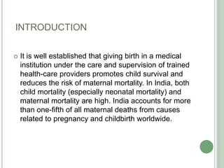 This document discusses the importance of institutional deliveries in India. It notes that India has high maternal and child mortality rates. Institutional deliveries, where birth takes place at a medical facility with trained staff, can help reduce these rates by providing proper medical care and addressing complications. However, utilization of institutional delivery services remains low in India due to various socioeconomic barriers like poverty, lack of education, and distance from health facilities. The National Rural Health Mission and Janani Suraksha Yojana aim to increase institutional deliveries among poor women through cash incentives and improving access to healthcare.