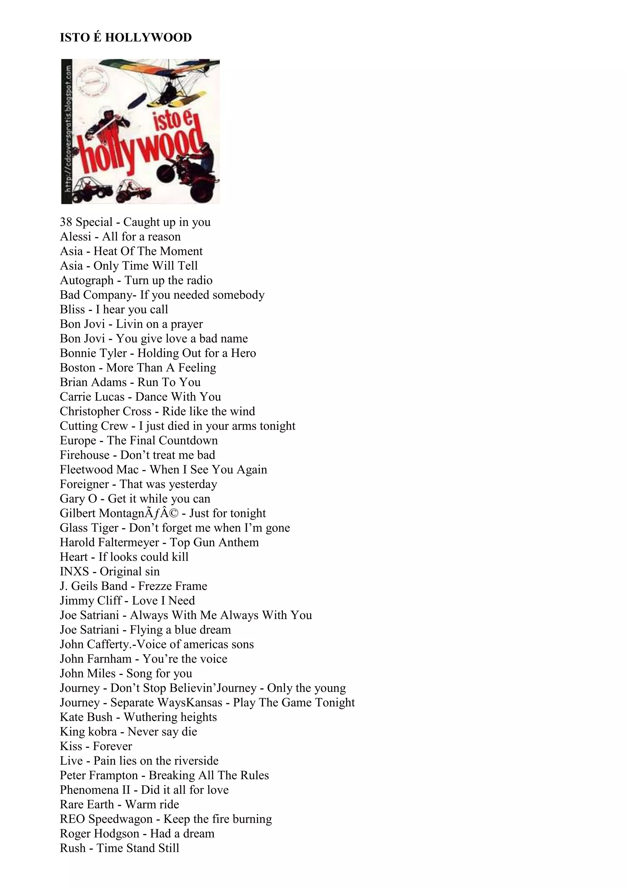 This document contains a list of over 100 songs from the 1980s along with download links and a link to a blog about album covers. The songs span many popular artists from that era like Journey, Bon Jovi, Boston, Van Halen, The Police, Survivor, and more. Links are provided to download three MP3 files containing songs from a compilation titled "Isto e Hollywood."