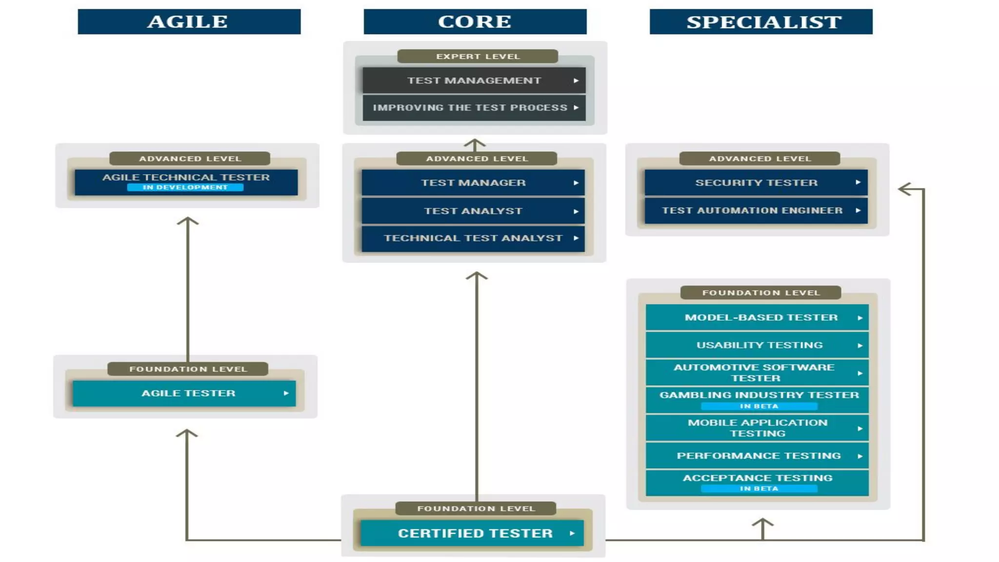 - The typical career path for a tester starting with ISTQB Foundation Level and progressing to advanced levels and management roles over 5-10+ years.