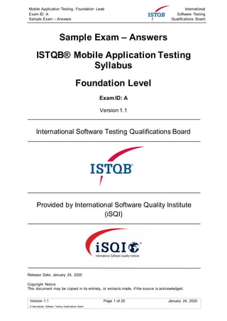 This document is a sample exam for the ISTQB mobile application testing foundation level, including answers and justifications for each question. It serves as a resource for ISTQB member boards to assist in creating questions and doesn't contain content for official examinations. The document outlines the roles of contributors and includes a revision history, purpose, and structured answer formats.