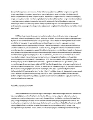 Dokumen ini membincangkan isu tekanan di kalangan guru di Malaysia, dengan menekankan bahawa tekanan boleh memberi kesan negatif kepada fizikal dan mental guru, serta kualiti pendidikan. Pelbagai faktor, termasuk beban kerja, disiplin pelajar, dan harapan tinggi dari ibu bapa, menyumbang kepada stres yang dialami oleh guru. Akibat tekanan yang tidak ditangani dengan baik boleh menyebabkan tindakan drastik oleh guru dan menjejaskan proses pembelajaran di sekolah.