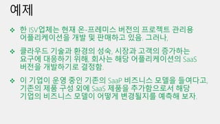 클라우드 컴퓨팅은 사용자 관점에서 가장 많은 변화를 가져오는 듯 하지만, 공급자 관점에서도 많은 혁신을 요구하고 있지만 전문소프트웨어 개발업체 (ISV)들에게도 비지니스 모델의 혁신을 요구하고 있습니다. 이 자료는 비지니스 모델 캔버스 방법론을 이용해서 ISV들의 비지니스 모델 변화를 파악할 수 있는 기회를 제공하고자 작성되었습니다.