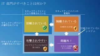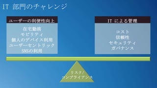 #19 アプリケーションはデバイスにインストールされいるという前提だと、アプリケーションがインストールされていないデバイスはアクセスできないアクセス権は「デバイス」に対して与えるものだという前提だと、個人のデバイスにはアクセス権は与えられない->そうではなくて、デバイスの状態によってリアルタイムに判断する必要がある。そうじゃないと、個人のデバイスには永遠にアクセス権が与えられないKey Points:The two trends specific to enabling Consumerization from an ITPro and Management and Security perspective are how to manage diverse devices that are arriving in the enterprise, as well as how to ensure productivity of employees on these devices in a secure manner.Talk Track:The changing work environment presents some challenges to IT departments. The two trends specific to enabling Consumerization from an ITPro and Management and Security perspective are how to manage diverse devices that are arriving in the enterprise, as well as how to help employees connect to others on these devices, and have access their apps and data, in a secure manner.We will be talking about the paradigm shifts that need to occur as well as the infrastructure required in order to support the management of devices as well as provide secure productivity from anywhere, anytime on any device.In order to support the management of diverse devices two paradigm shifts need to occur there is a tension between users and device centric thinking. There is also a tension between corporate owned and consumer owned devices and how to support them.In order to provide secure, anywhere access to apps and data, IT needs to provide application infrastructure that is consistent as well as optimized for devices in order to allow employees to be productive. IT then also needs to ensure they have a security and access model in place that can handle the demands of consumerization.