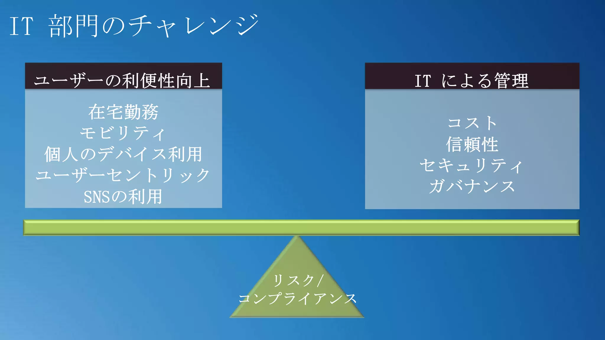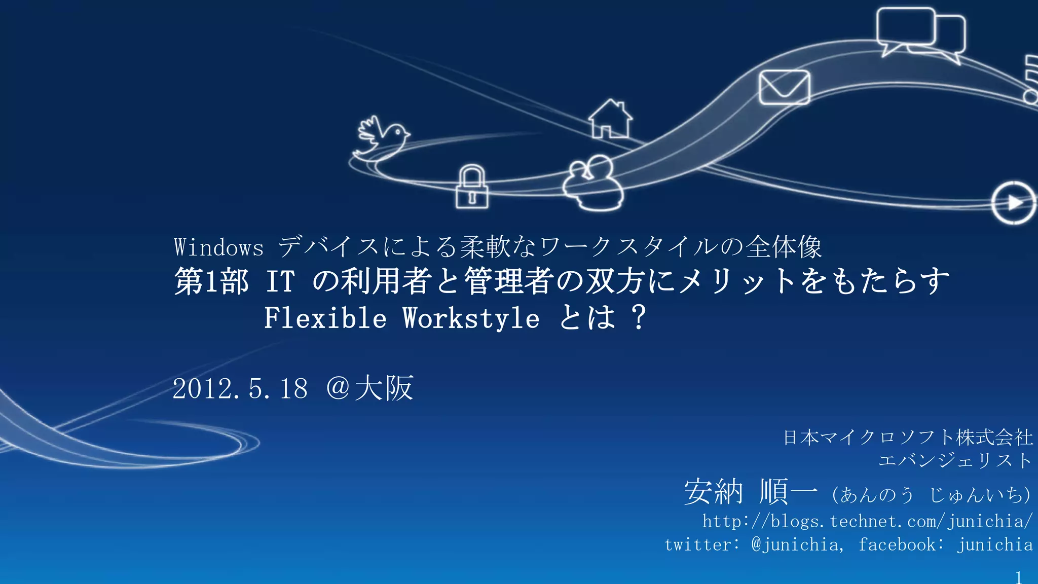 #17 ざくっと言ってしまえば、課題は2つ!デバイス管理...というと MDM を考えるかもしれないけど、それは違う!それ以前が出来ていないのです!アプリケーションのセキュリティとかいうと、アクセス権管理の手間を考えるでしょう?それも違う!それ以前が問題なのですKey Points:The two trends specific to enabling Consumerization from an ITPro and Management and Security perspective are how to manage diverse devices that are arriving in the enterprise, as well as how to ensure productivity of employees on these devices in a secure manner.Talk Track:The changing work environment presents some challenges to IT departments. The two trends specific to enabling Consumerization from an ITPro and Management and Security perspective are how to manage diverse devices that are arriving in the enterprise, as well as how to help employees connect to others on these devices, and have access their apps and data, in a secure manner.We will be talking about the paradigm shifts that need to occur as well as the infrastructure required in order to support the management of devices as well as provide secure productivity from anywhere, anytime on any device.In order to support the management of diverse devices two paradigm shifts need to occur there is a tension between users and device centric thinking. There is also a tension between corporate owned and consumer owned devices and how to support them.In order to provide secure, anywhere access to apps and data, IT needs to provide application infrastructure that is consistent as well as optimized for devices in order to allow employees to be productive. IT then also needs to ensure they have a security and access model in place that can handle the demands of consumerization.