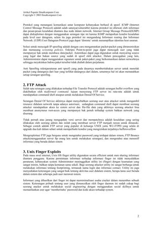 Dokumen ini membahas berbagai jenis serangan cracker yang umum terjadi, termasuk ip spoofing, ftp attack, dan e-mail exploits, serta metode untuk mencegahnya. Pengetahuan tentang serangan ini penting bagi administrator dan pengguna untuk menjaga stabilitas sistem. Artikel ini juga menggarisbawahi perlunya review berkala terhadap keamanan sistem yang ada.