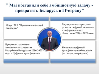 Документ описывает государственную программу цифровой трансформации в Беларуси на 2016-2020 годы, направленную на развитие IT-отрасли и подготовки специалистов. Основные положения включают правовую поддержку, льготы для IT-компаний и образовательные инициативы, обеспечивающие подготовку кадров. Программа охватывает взаимодействие университета с производством, проведение мероприятий и тренингов для повышения квалификации студентов и преподавателей.