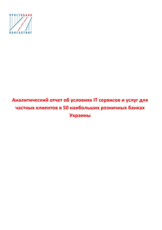 Аналитический отчет охватывает условия и услуги интернет-банкинга для частных клиентов в 50 крупнейших розничных банках Украины. Документ анализирует общие характеристики, ценовые условия, функциональные возможности систем, а также условия авторизации и рынок активности. Основное внимание уделяется внедрению новых онлайн-услуг, а также сбору данных через тестирование банковских систем и опросы экспертов.