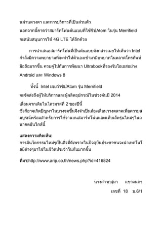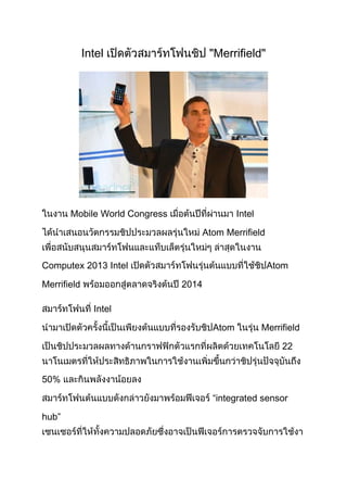 Intel announced their new Atom Merrifield mobile processor at Mobile World Congress and Computex 2013, with plans to launch devices using the chip in 2014. The Merrifield is an updated version of Intel's Atom processor that promises up to 50% better performance and an "integrated sensor hub" to support devices running Android, Windows 8, or Ultrabook-style designs with 4G LTE connectivity.