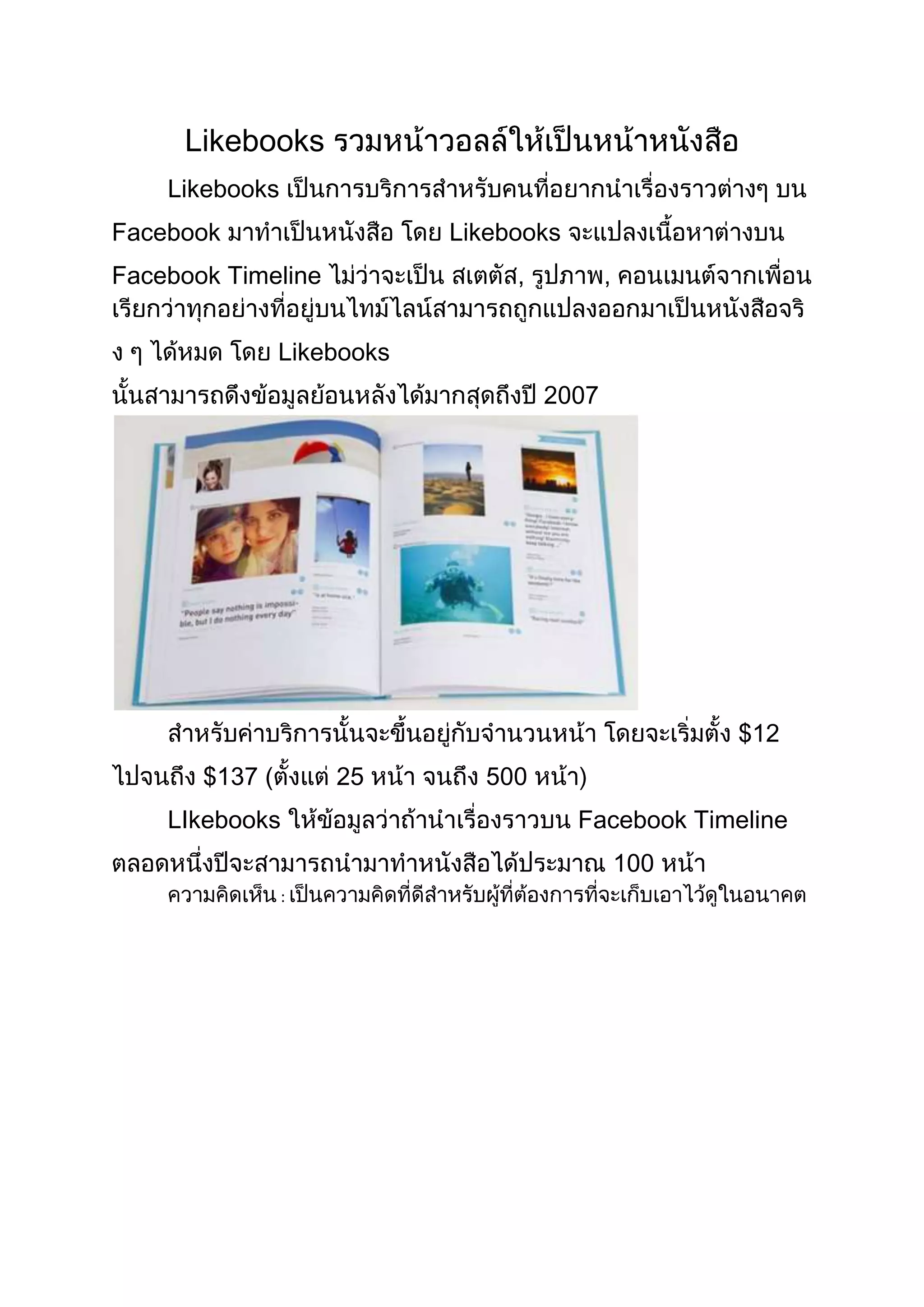 Likebooks allows users to create printed books based on their Facebook timeline activity from 2007 onward. The service takes up to 100 of a user's most liked Facebook posts and compiles them into a printed book for $12 plus shipping. Since launching in 2007, Likebooks has produced over 25,500 personalized books totaling $137,000 in sales.