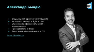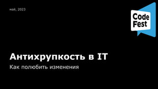 Документ обсуждает концепцию антихрупкости в сфере IT, подчеркивая значение адаптивности к изменениям и необходимые качества для успешного реагирования на них. Основное внимание уделяется важности внутреннего качества систем и взаимопонимания между заказчиками и исполнителями для достижения гибкости и устойчивости. Приводятся практические рекомендации по управлению проектами и построению процессов, которые могут выдерживать изменения без потери качества.