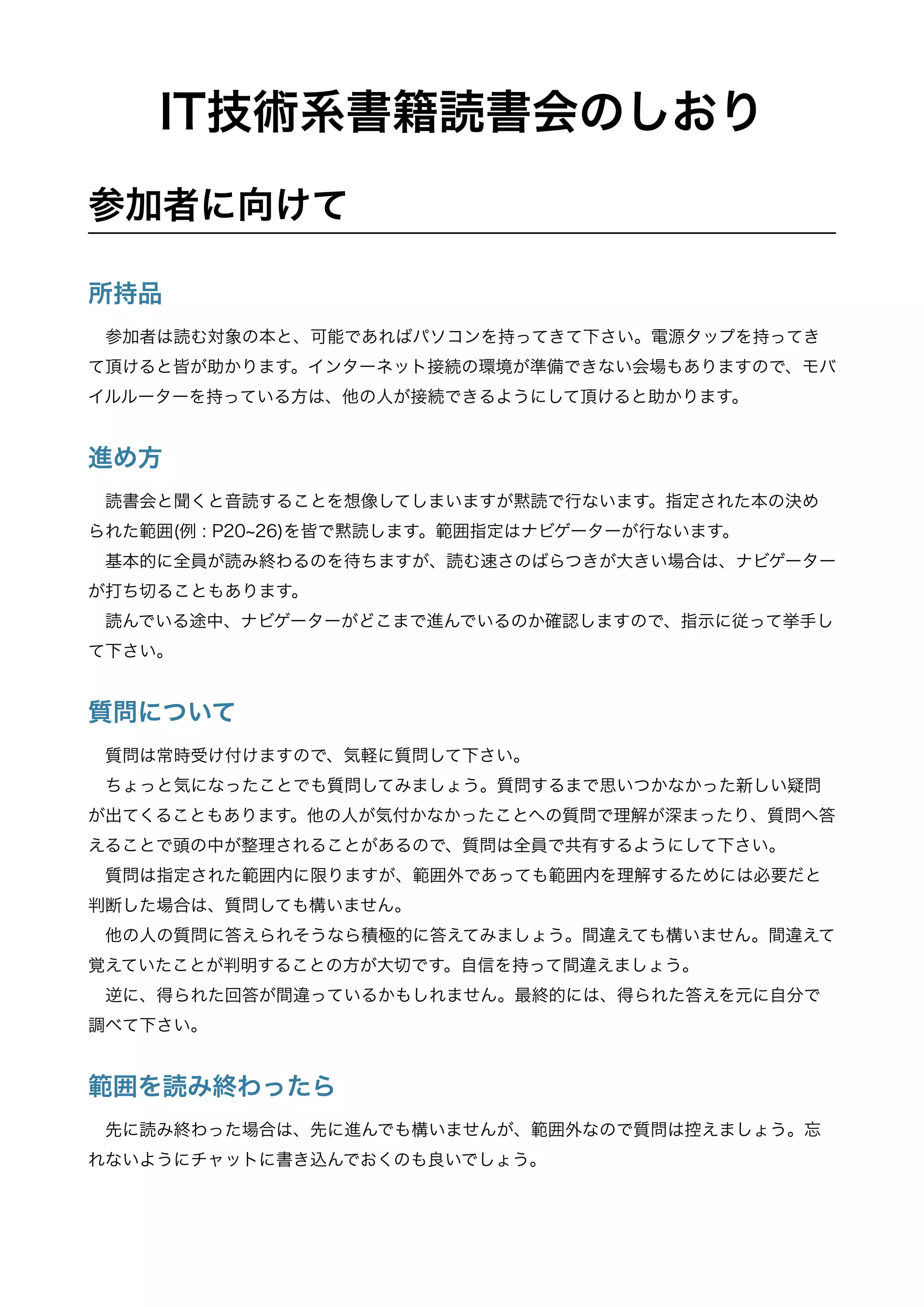 IT技術系の書籍で読書会を行なう時の、参加者に向けた案内と、開催する時のノウハウをまとめました。