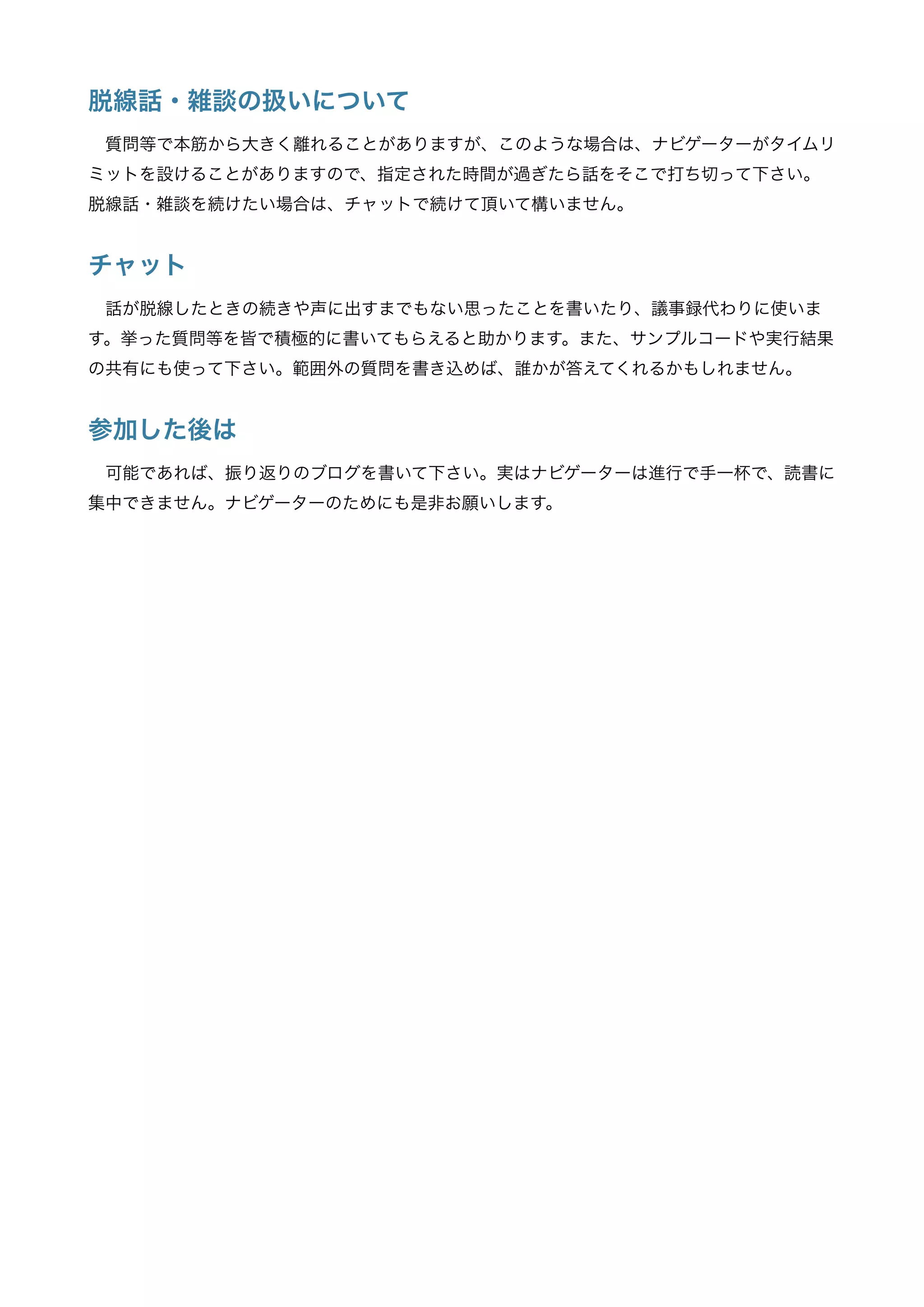 脱線話・雑談の扱いについて 質問等で本筋から大きく離れることがありますが、このような場合は、ナビゲーターがタイムリ ミットを設けることがありますので、指定された時間が過ぎたら話をそこで打ち切って下さい。 脱線話・雑談を続けたい場合は、チャットで続けて頂いて構いません。 チャット 話が脱線したときの続きや声に出すまでもない思ったことを書いたり、議事録代わりに使いま す。挙った質問等を皆で積極的に書いてもらえると助かります。また、サンプルコードや実行結果 の共有にも使って下さい。範囲外の質問を書き込めば、誰かが答えてくれるかもしれません。 参加した後は 可能であれば、振り返りのブログを書いて下さい。実はナビゲーターは進行で手一杯で、読書に 集中できません。ナビゲーターのためにも是非お願いします。