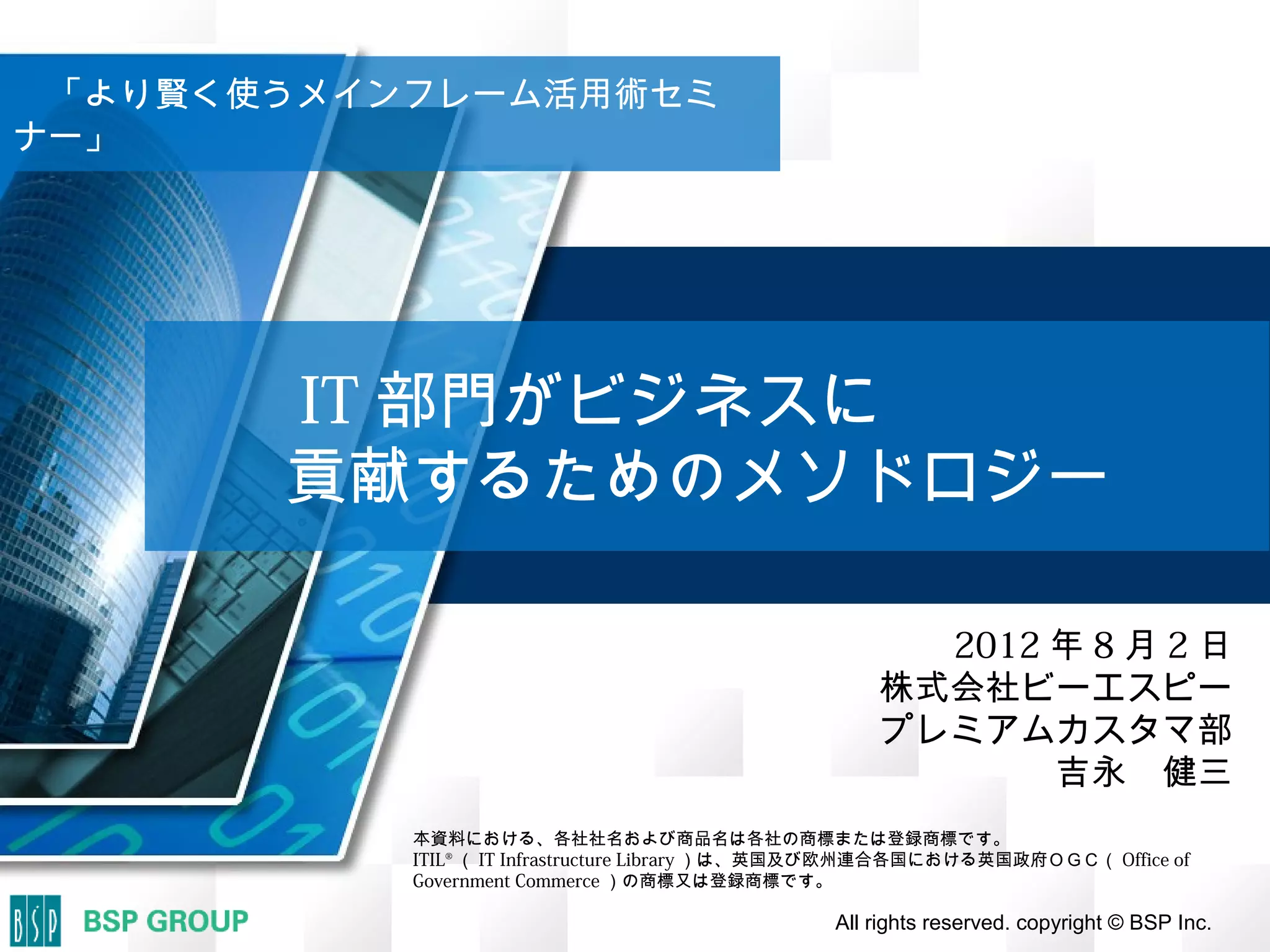 copyright © BSP Inc. 「より賢く使うメインフレーム活用術セミ ナー」 2012 年 8 月 2 日 株式会社ビーエスピー プレミアムカスタマ部 吉永 健三 IT 部門がビジネスに 貢献するためのメソドロジー 本資料における、各社社名および商品名は各社の商標または登録商標です。 ITIL® ( IT Infrastructure Library )は、英国及び欧州連合各国における英国政府OGC( Office of Government Commerce )の商標又は登録商標です。
