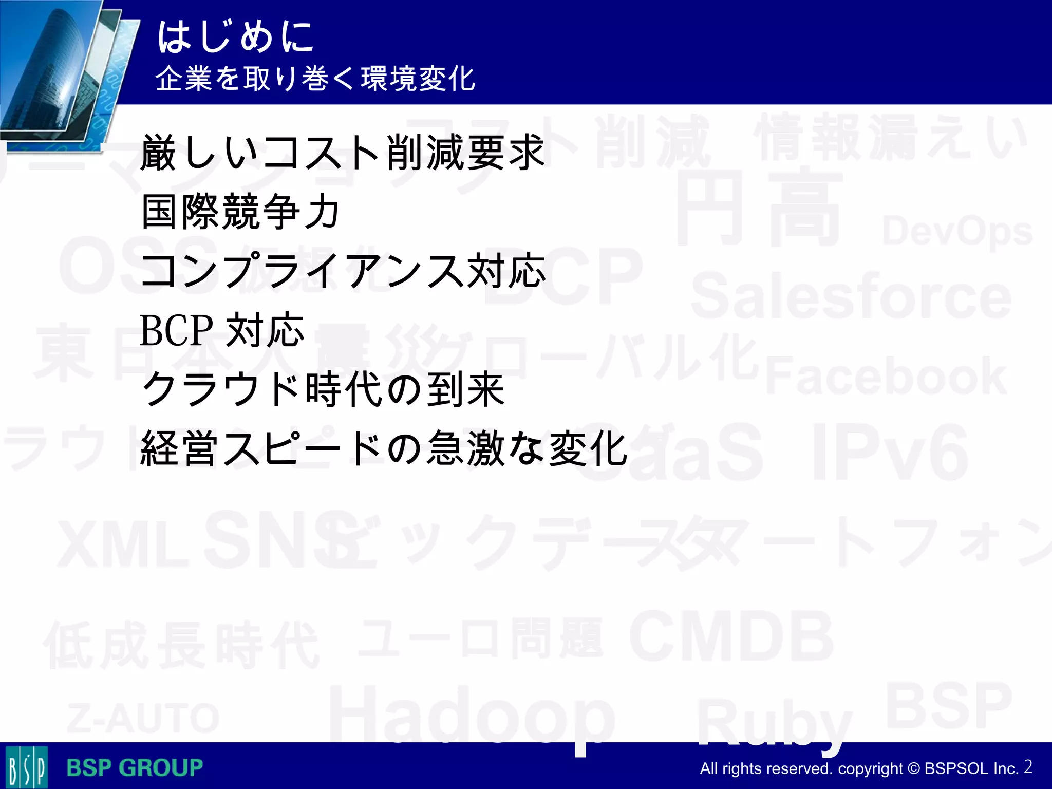 reserved. copyright © BSPSOL Inc. リーマンショック 円高 OSS BCP 東日本大震災グローバル化Facebook ラウドコンピューティング XML SNSビックデータスマートフォン Hadoop CMDB低成長時代 仮想化 SaaS IPv6 Salesforce ユーロ問題 RubyZ-AUTO BSP はじめに 企業を取り巻く環境変化 コスト削減 情報漏えい DevOps 厳しいコスト削減要求 国際競争力 コンプライアンス対応 BCP 対応 クラウド時代の到来 経営スピードの急激な変化 2