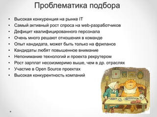 Документ описывает ключевые этапы и методы подбора идеального кандидата в IT-сфере, включая составление профиля должности, анализ требований и способы оценки кандидатов. Он акцентирует внимание на конкурентности рынка, важности командных отношений и роль рекрутера в процессе поиска. Также приводятся рекомендации по коммуникации с заказчиком и критериям оценки кандидатов.