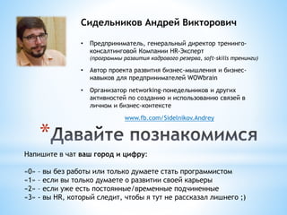 Документ представляет собой презентацию Андрея Сидельникова, посвященную развитию карьеры и профессиональным навыкам для предпринимателей и специалистов в HR. Основное внимание уделяется важности балансировки hard-skills и soft-skills в зависимости от карьерных целей, а также необходимости активного планирования и выполнения личного плана развития. Также подчеркивается, что карьерный рост всегда требует целенаправленных усилий и формирования сети профессиональных контактов.