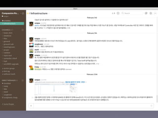 #12 이게 슬랙의 기본적인 화면입니다. 왼쪽에는 대화방과 같은 채널들이 존재하고 오른쪽에는 해당 대화방의 컨텐츠가 보입니다.