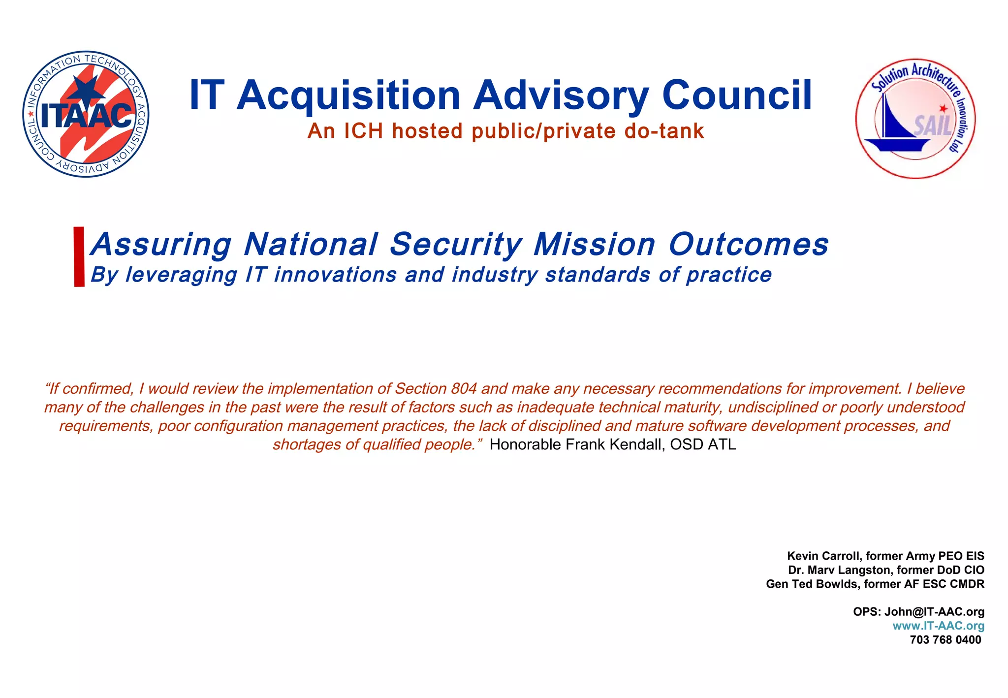 The document discusses establishing an IT Acquisition Advisory Council (IT-AAC) as a public-private partnership to help improve the acquisition of IT systems for national security. It notes that the IT-AAC would leverage innovations and industry standards of practice to help assure successful mission outcomes. It provides background on key leaders who would advise the IT-AAC. The IT-AAC aims to provide decision-makers with expert advice and methods drawn from real-world IT implementations to help modernize acquisition processes and better implement commercial technologies.