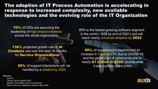 - Automation adoption is accelerating in response to increased IT complexity and new technologies. RPA is the fastest growing software segment and will reach near universal adoption by 2023. 85% of support interactions will be handled by chatbots by 2025.
