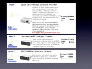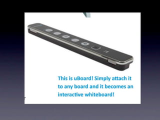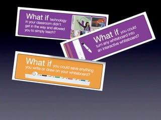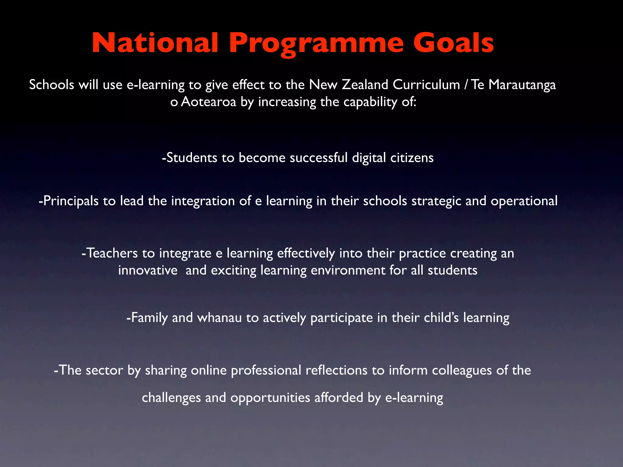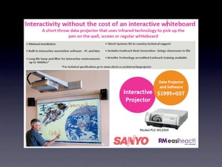 This document outlines goals and plans for integrating e-learning at a school over the next year. The national goals are for students to become successful digital citizens, for principals to lead e-learning integration, and for teachers to effectively integrate e-learning. The school will form teacher groups to focus on key tools and share learning. Surveys will track staff e-learning use and confidence. Options for computer access are discussed, such as distributing desktops among classrooms and adding mobile devices. Progress will be measured through group plans, student work samples, and reflections shared on a wiki.