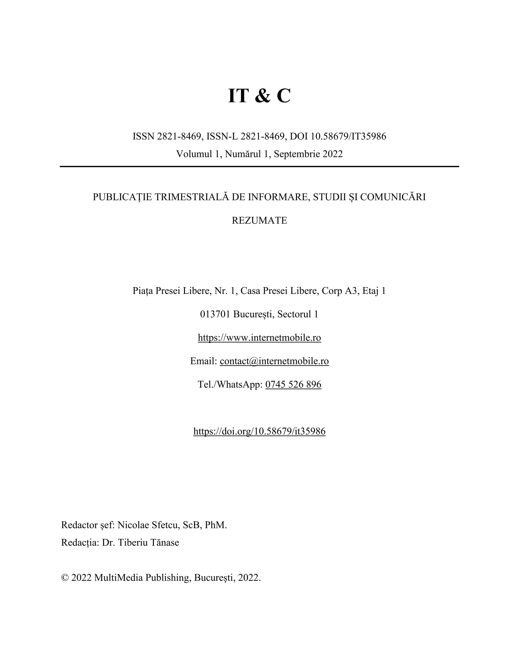Revista "IT & C", volumul 1, numărul 1, publicată în septembrie 2022, abordează teme variate din domeniul tehnologiei informației, inclusiv impactul internetului, blockchain, tehnologia 5G, big data, programare în Python, dezvoltare Wordpress și marketing de conținut. Editorul șef, Nicolae Sfetcu, subliniază influența majoră a internetului asupra societății contemporane, iar articolele oferă o analiză detaliată a trendurilor și provocărilor în acest sector. Fiecare secțiune oferă resurse utile pentru profesioniștii din domeniu, evidențiind importanța adaptării la noile tehnologii.