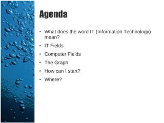 The document discusses career planning in information technology. It defines IT as using technology to manipulate and process information. The main IT fields covered are computer skills, soft skills, and language skills. Computer skills include hardware, software, operating systems, programming, databases, graphics, and networks. Soft skills discussed include time management, communication, and teamwork. The document recommends obtaining at least two languages in addition to your native language. It suggests starting an IT career through training centers, self-learning, e-learning, or certification programs.