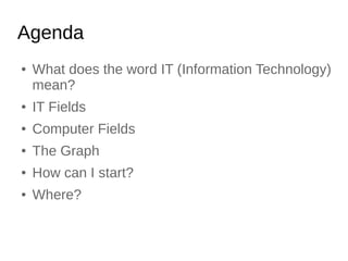 The document provides an overview of career planning in the IT field, discussing the meaning of information technology, its various disciplines, and essential skills required for success. It also emphasizes the importance of choosing the right working environment and suggests resources for learning programming, databases, graphics, and networking. Additionally, it highlights the necessity of soft skills and continuous learning to thrive in the IT industry.