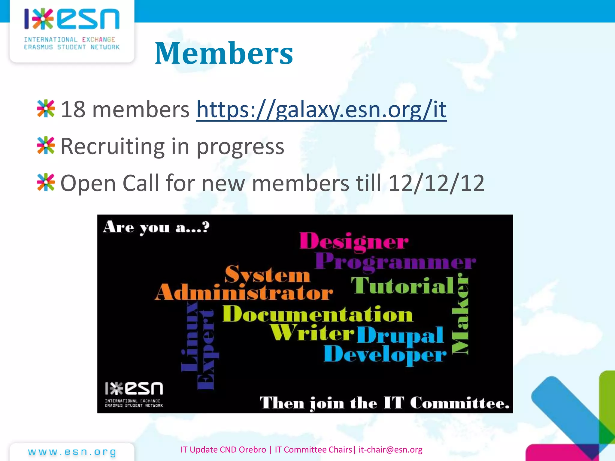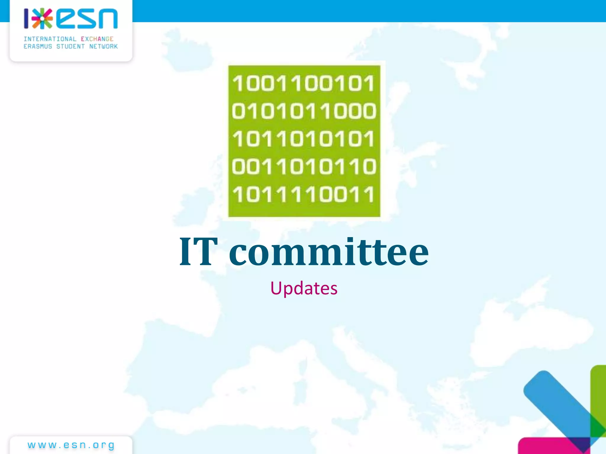 1) The IT committee has 18 members and is recruiting new members until December 12th. 2) Past meetings included discussions around server virtualization, alternative solutions for the infocenter, a new Galaxy strategy, and mobile app ideas. 3) Upcoming meetings will take place in Brussels from December 14-16 with 8-10 members attending.