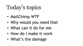This document summarizes a MailChimp workshop covering topics such as what MailChimp is, why email marketing is useful, MailChimp features like the email designer and automation, tutorials on using MailChimp, and pricing plans. It discusses how MailChimp can be used to build an email list and send marketing campaigns while tracking results. Integrations with other platforms and tools are also mentioned.