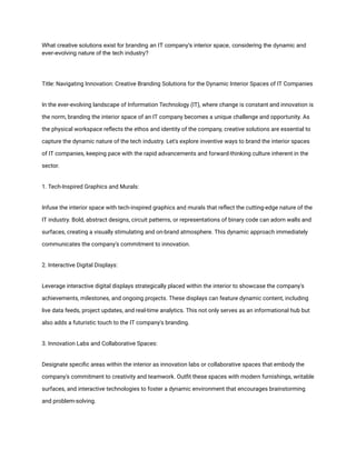 The document discusses creative branding solutions for the interior spaces of IT companies. It suggests leveraging tech-inspired graphics, interactive digital displays that showcase projects and data, and innovation labs and collaborative spaces to encourage creativity. Other ideas include branded environmental graphics, technology showcases, flexible branding elements that can be updated, gamified workspaces, digital art installations, personalized workstations, and employee-driven branding initiatives. The goal is to create a dynamic interior that reflects the evolving nature of the tech industry and fosters innovation through strategic and creative branding approaches.